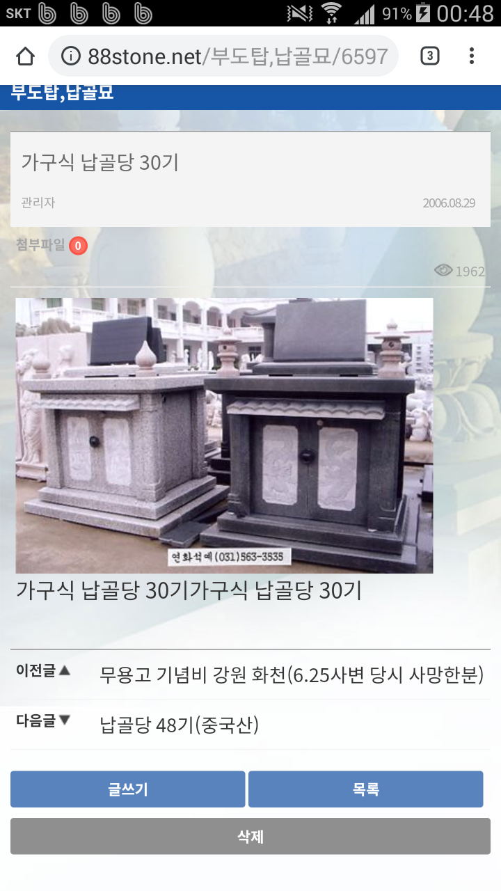 01 02 03 04 05 06 07 08 88석재소재 Greeting 88석재 (구.연화석예석재) 사찰의 석조불사는 이제부터 저희 88석재에 맡겨주십시오. 온라인문의온라인을 통해 문의 가능합니다. 오시는길88석재의 오시는 길을 안내합니다. 동영상보기 4사 방송출연 CUSTOMER CENTER 080-535-8888031-563-3535031-584-3330 010-6363-3030 불상, 조각 용왕각 영통사 용왕 아미타불 아미타불 석탑 및 석등 용왕탑 보토사 영천 다보탑 3층석탑 성불사 부석사 석등 부도탑, 납골묘 견적 영탑 신상리공덕비 신상리공덕비 제품 제작 공정 서울 삼성동 봉은사 약사여래불 후불 10자 23불 조성 서울 삼성동 보은사 23보살상 조성하는 중 약수사 아미타불29자 하남 약수사 점안 행사중